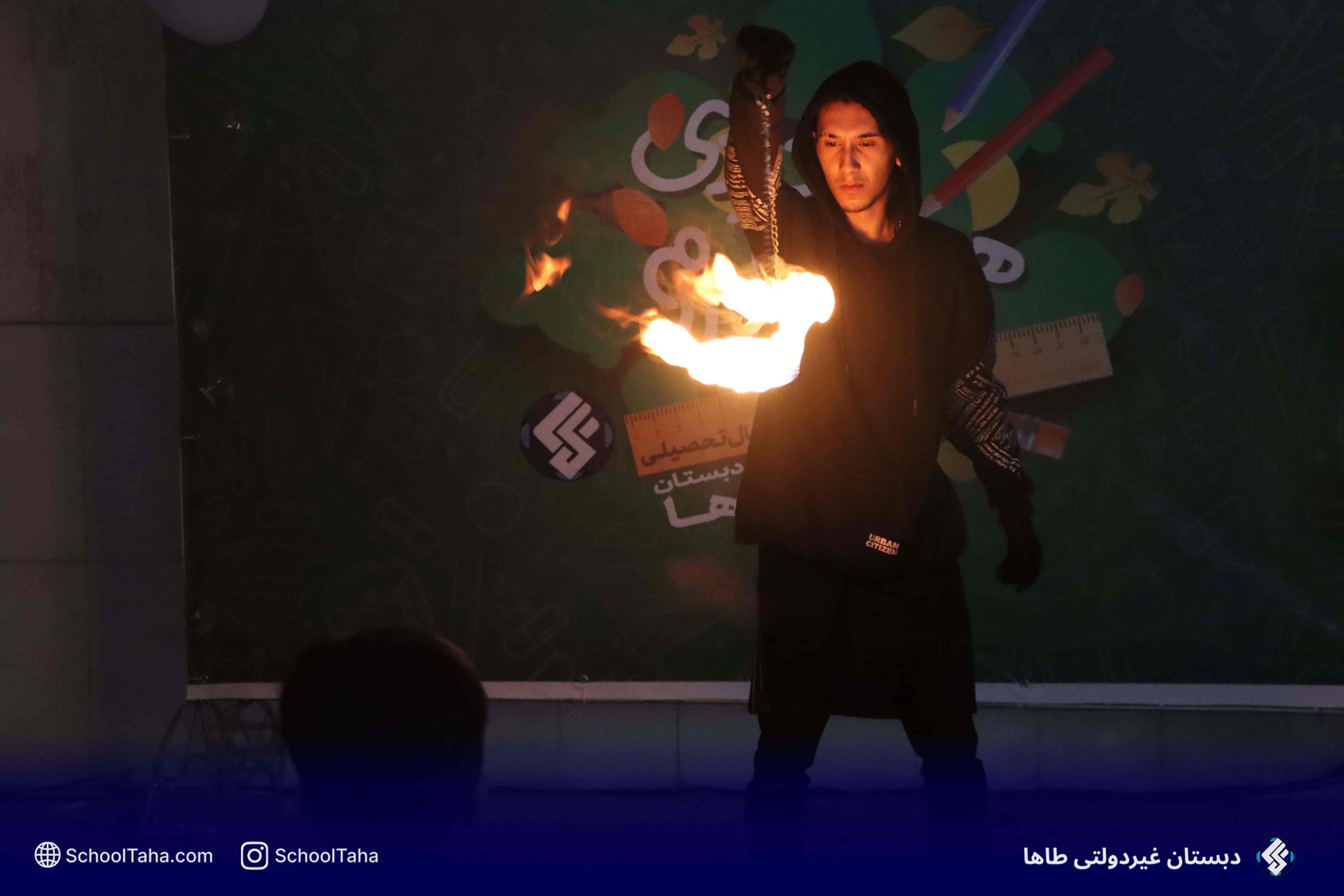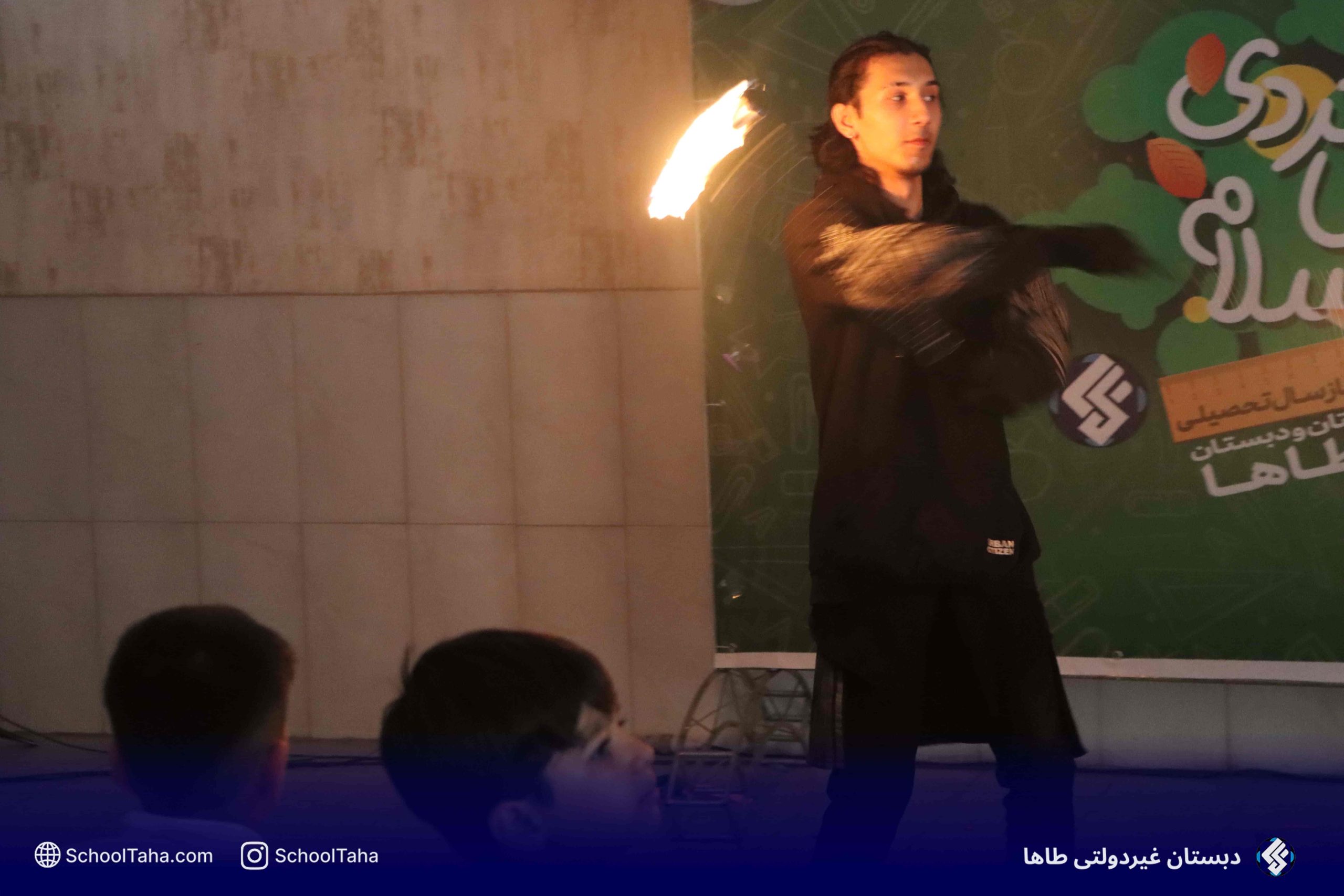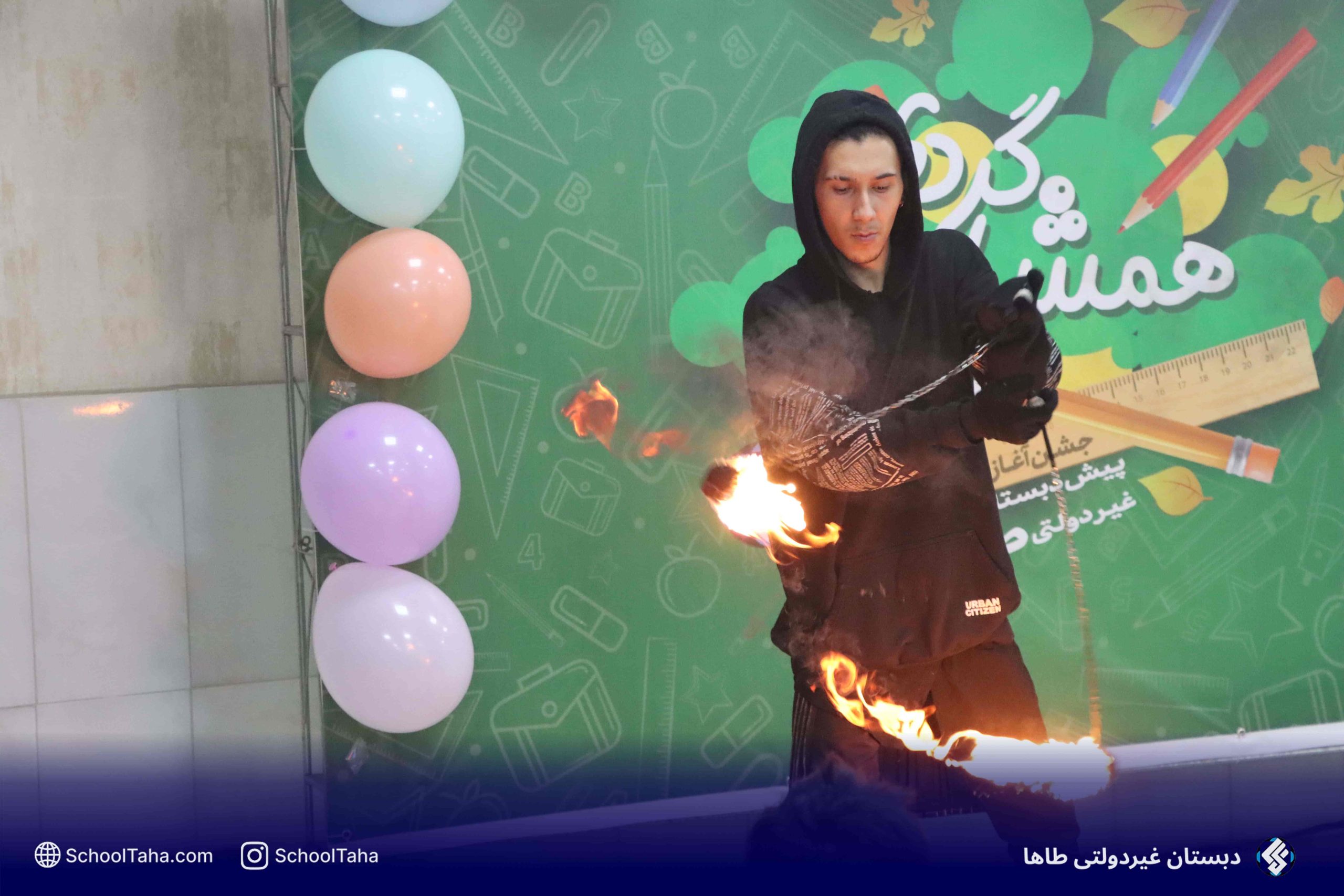 یکی از بخش‌های هیجان‌انگیز جشن، حضور شعبده‌باز بود! اول با میله‌ای ساده شروع کرد و در چند لحظه اون رو به یک پر بزرگ و رنگی تبدیل کرد. بعد هم با مهارتی خاص از دهنش شعله‌های آتش بیرون آورد، درست مثل اژدها! توپ‌های آتشینش در هوا می‌چرخید و همه با دهان باز از تعجب تماشا می‌کردند. بچه‌ها از شدت هیجان فریاد می‌زدند و با هر حرکت او دست می‌زدند.
